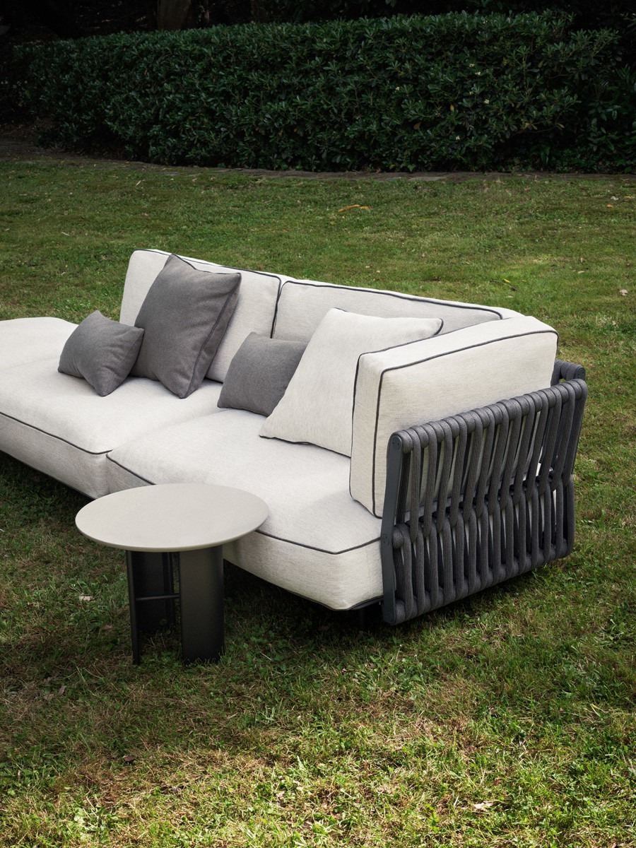 Soul is a collection of modular seating characterized by the interweaving of the backrest and armrests, as well as modular platforms with supporting cushions.The modularity of the frame allows you to structure armchairs and sofas in closed, double-sided or corner compositions, with integrated pouf and chaise longue.Upholstery available in the outdoor coverings as per collection with contrasting border.