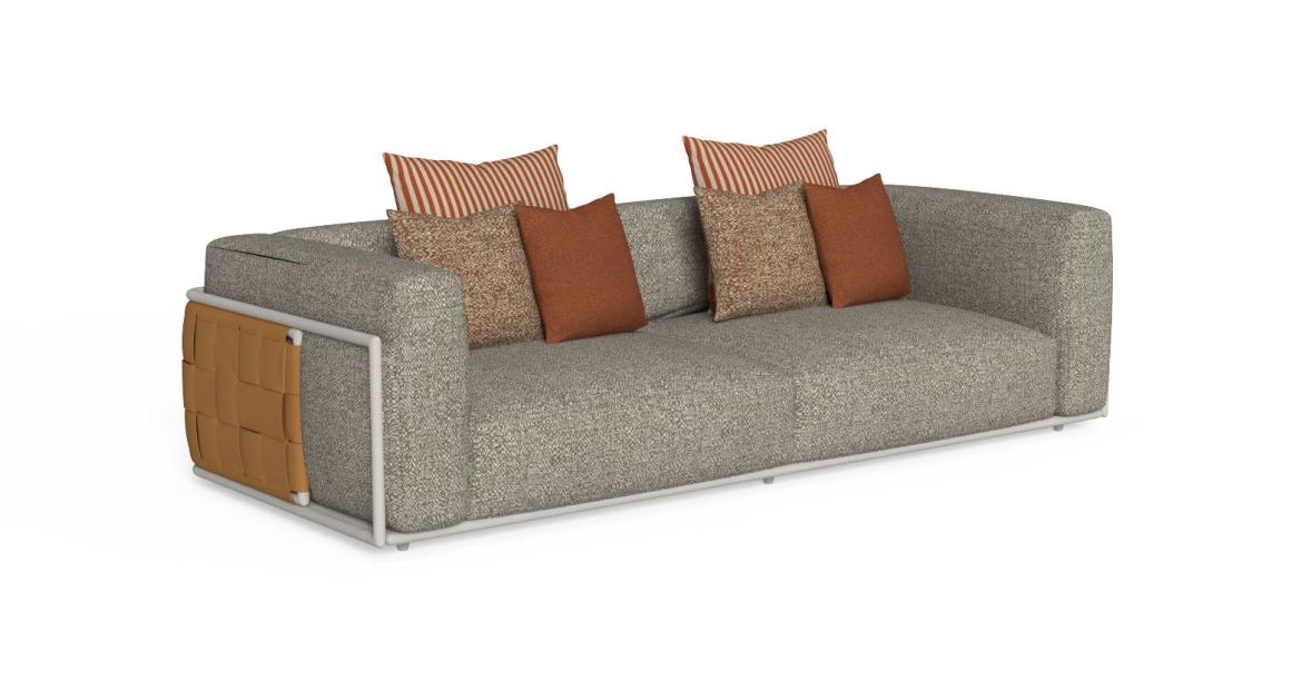The Tressé 3-seater sofa is able to adapt to any outdoor environment, thanks to a wide choice of color variations ranging from cold silk gray, to the most intense and decisive mud, up to stand out with the warm earth of Siena. Comfortable and sophisticated, this piece of furniture stands out for the fine finishes of the backs, supported by a tubular aluminum structure covered by hand, with masterfully woven eco-leather bands. A design solution that gives character to outdoor spaces and remedies the need for comfort.