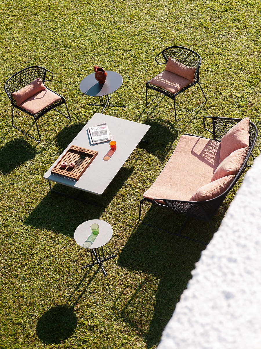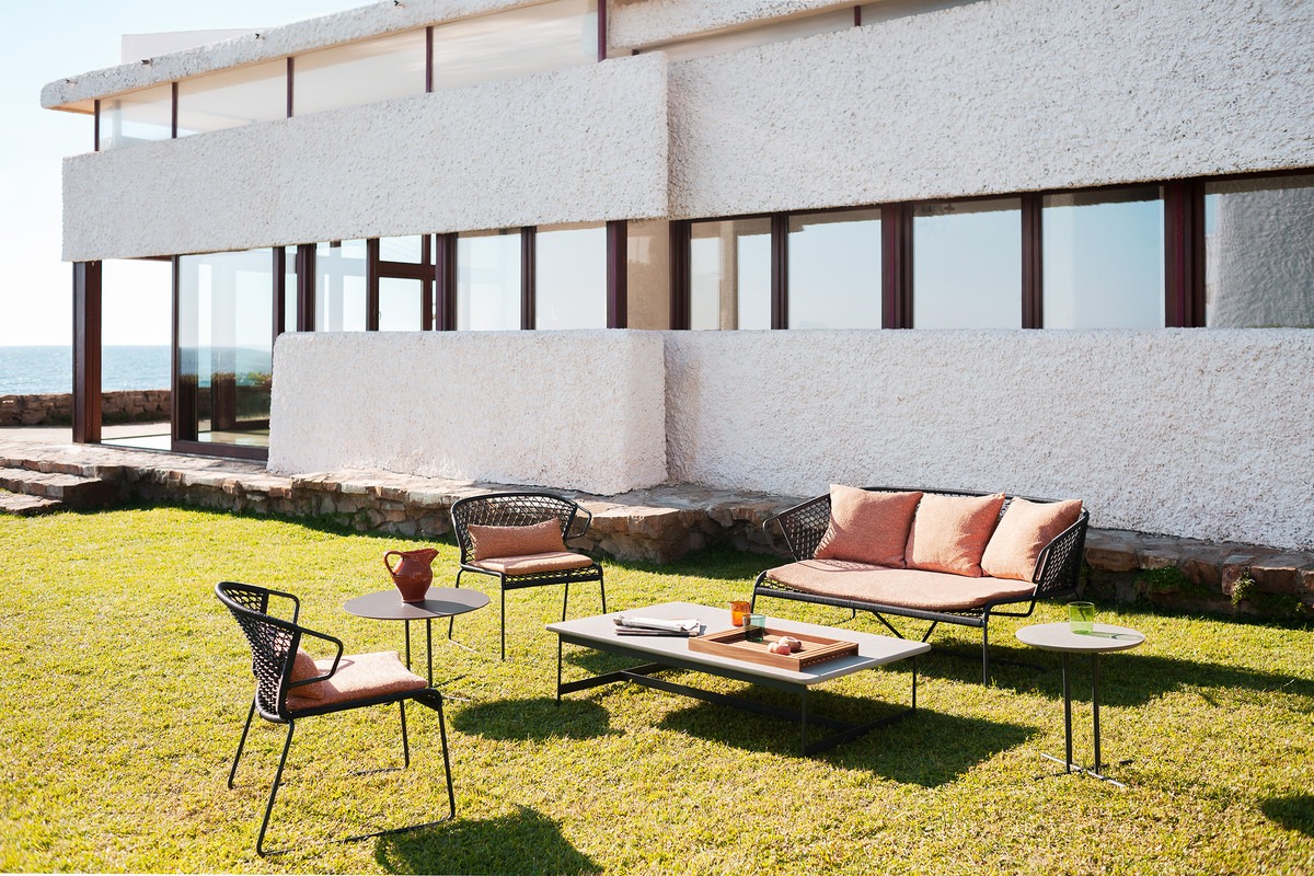 The Vela seating family, composed by stackable chair, small armchair and armchair, stools, and sofa is the perfect synthesis between design and craftsmanship.Characterized by a slender frame in painted metal tube with sled-shaped legs, and weaving in nautical or PVC rope, the Vela sofa represents the ideal piece of furniture for a veranda, the swimming pool or the garden.