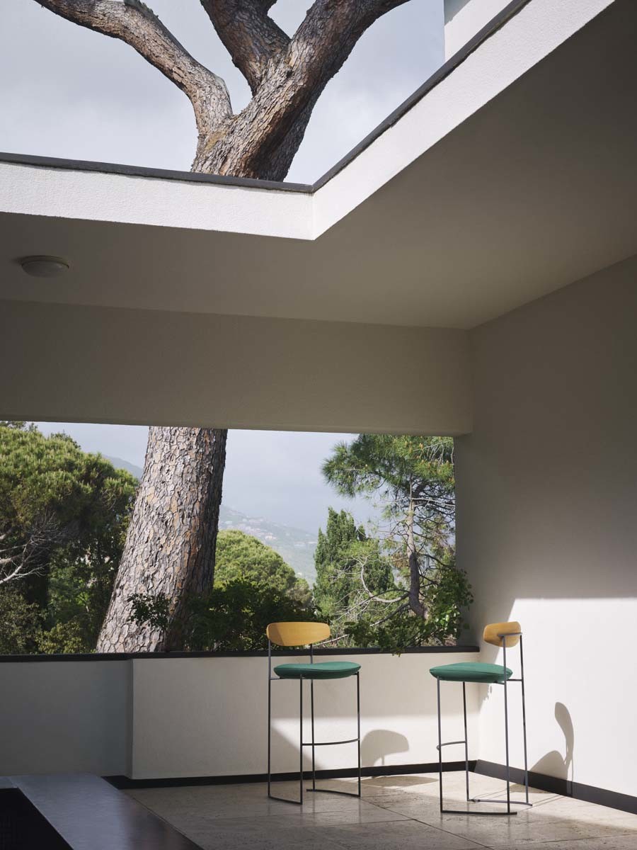 The Keel stools in two-heights, part of the homonymous collection consisting of chair, small armchair and armchair, have a linear structure in metal rod, an enveloping backrest in solid wood and padded, soft and sinuous support elements.