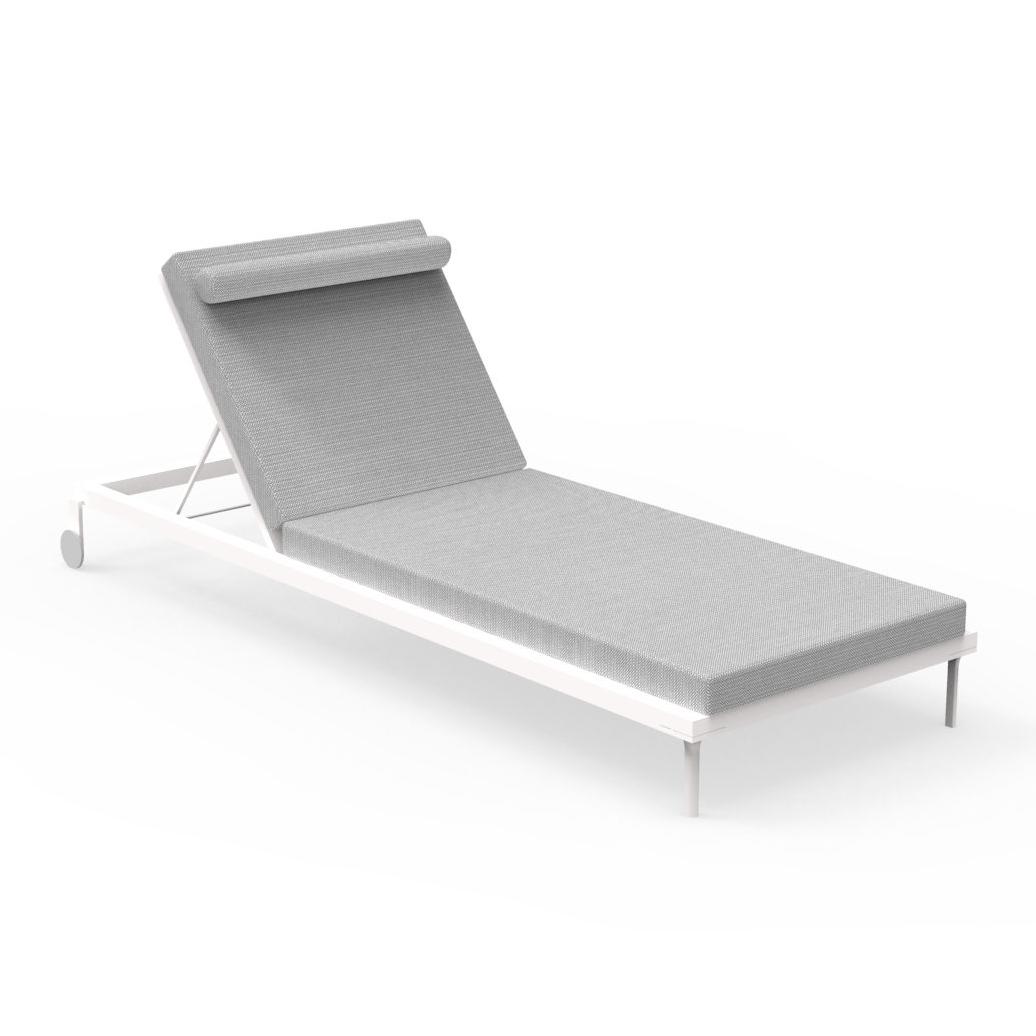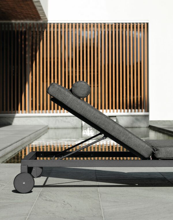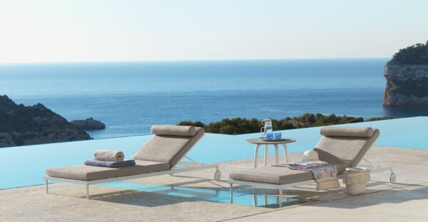 The ClaoAlu garden bed recalls the geometric lines of the voluminous living elements that make up the collection. The structure is in powder-coated aluminium and the backrest is reclinable. It has wheels and can be stacked. The cushions are removable, easy to wash and weather resistant. Quick dry foam padding.
