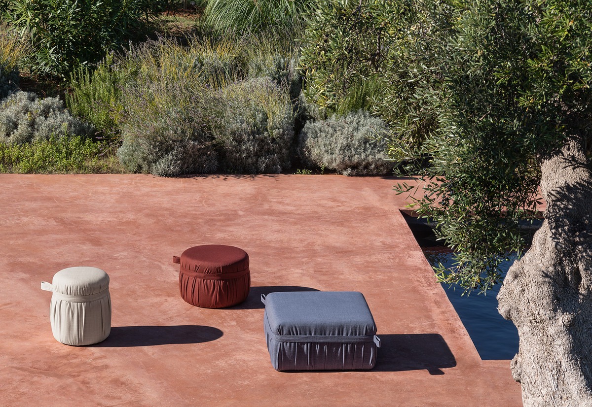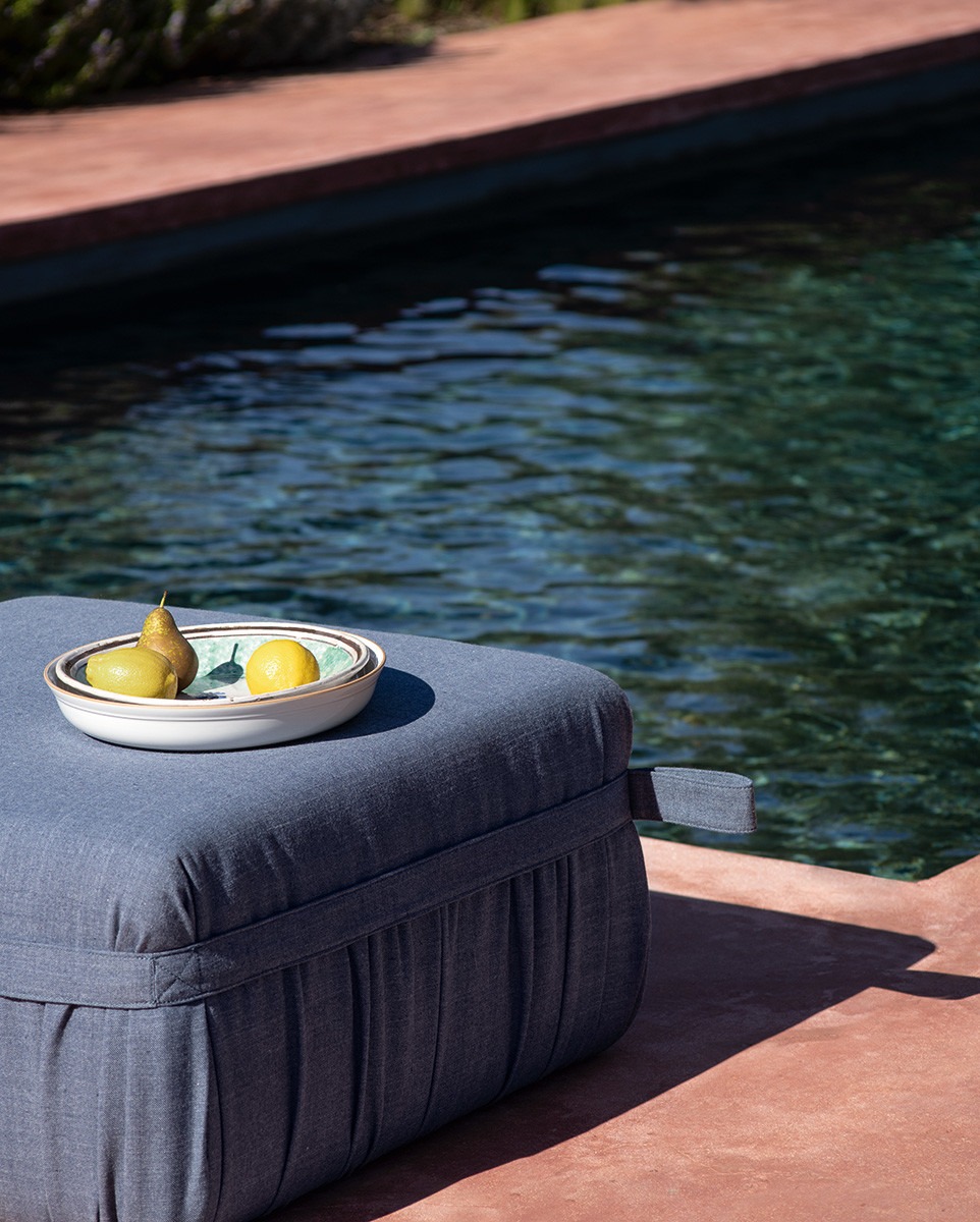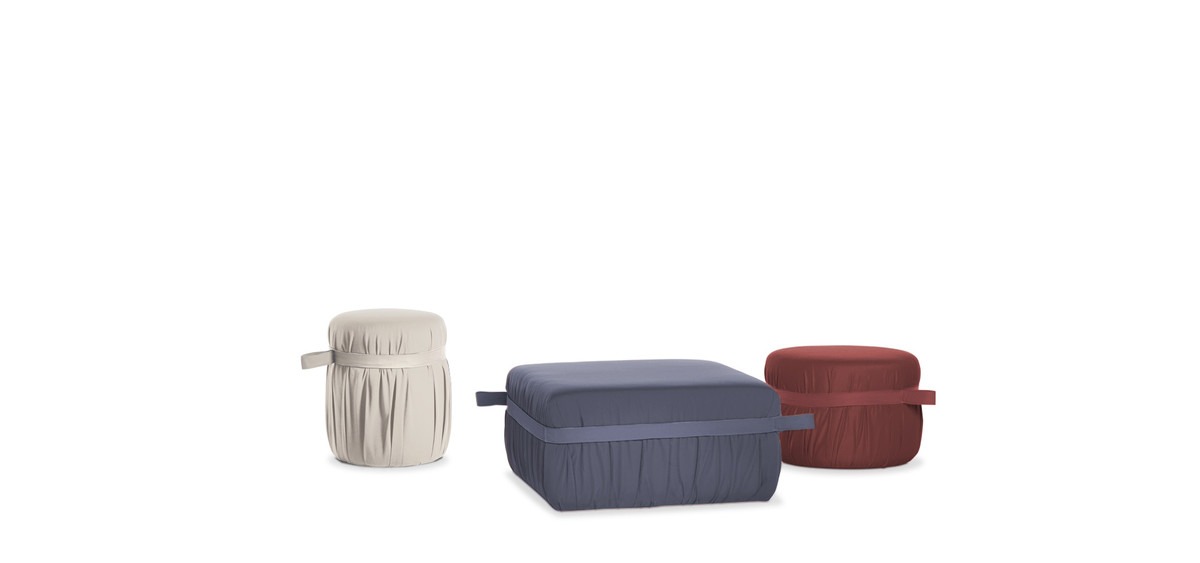 A tailored detail distinguishes the Herm pouf: a belt in fabric with visible stitching, surrounds the pouf creating fine pleats.A practical handle is fitted facilitating its movement.Available in 3 different shapes, Herm is entirely upholstered with the fabrics and leathers as per collection, and padded with fire retardant polyurethane foam. It is suitable for customizing terraces and gardens.