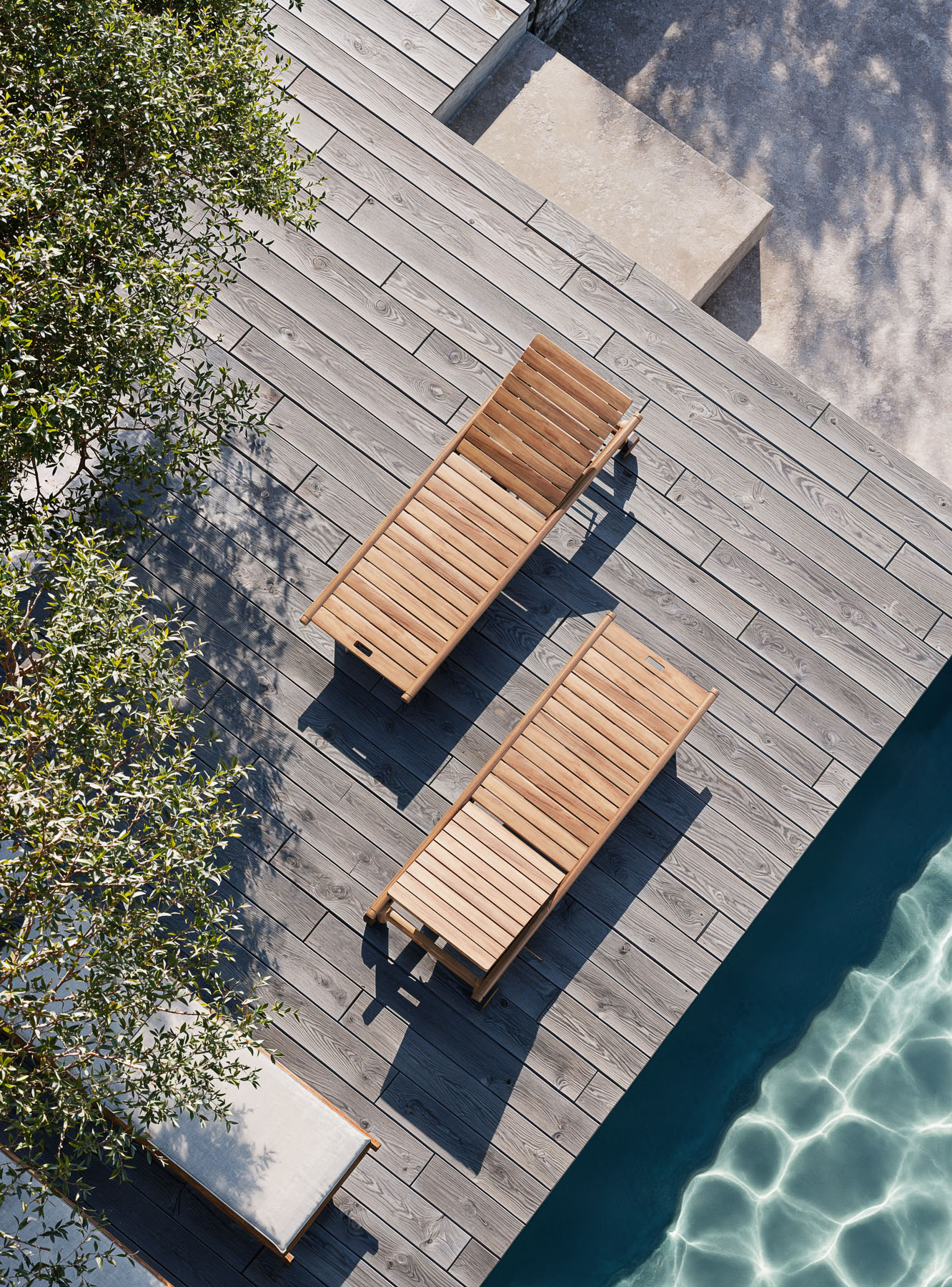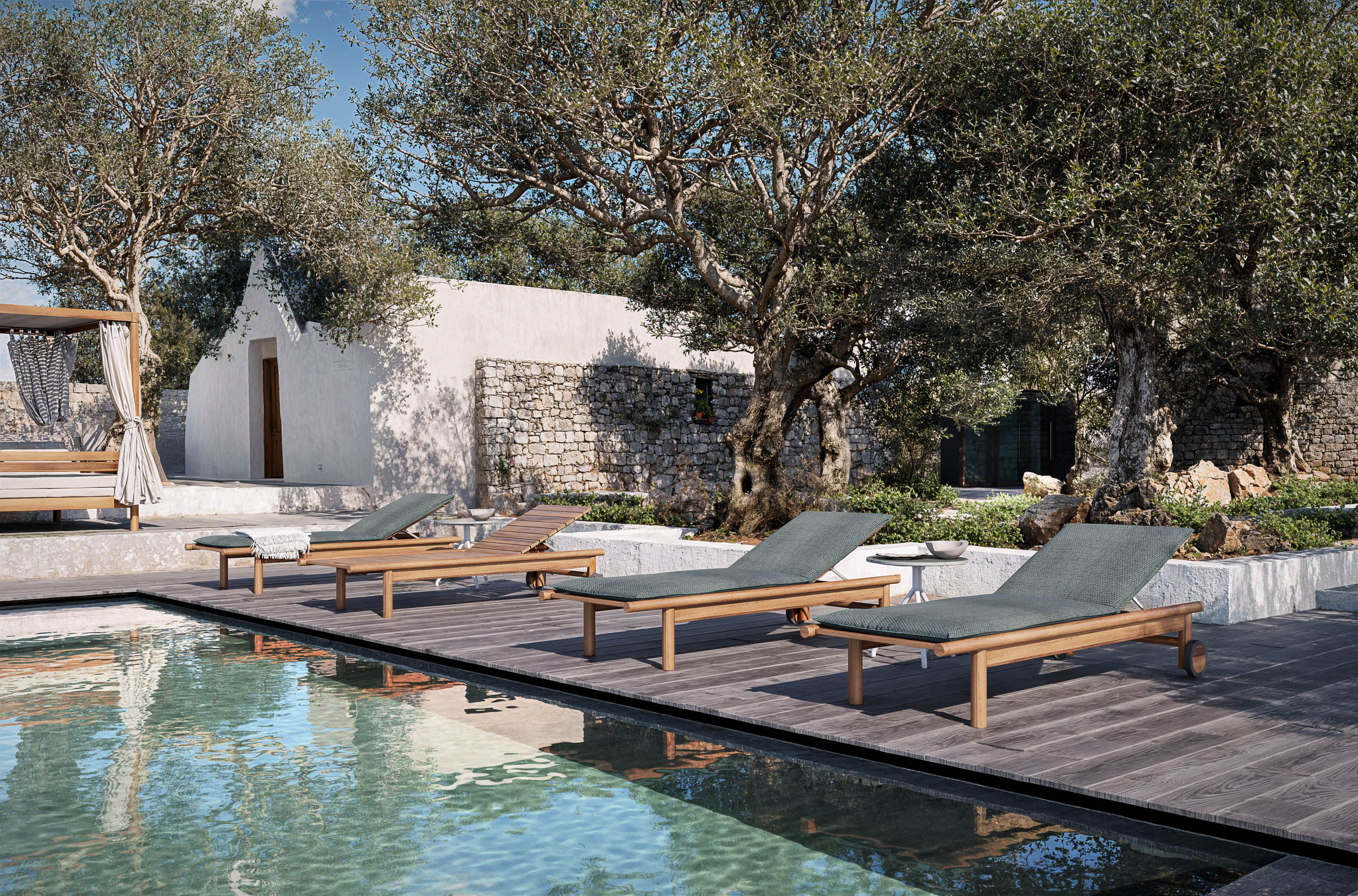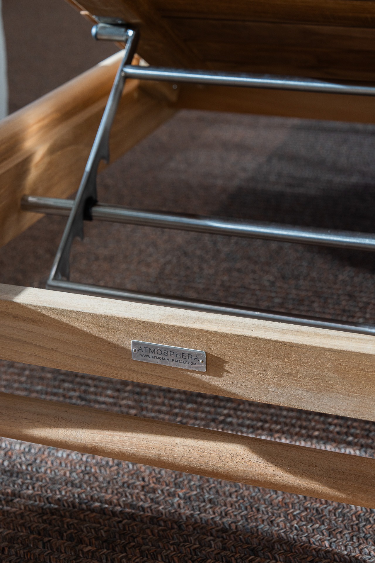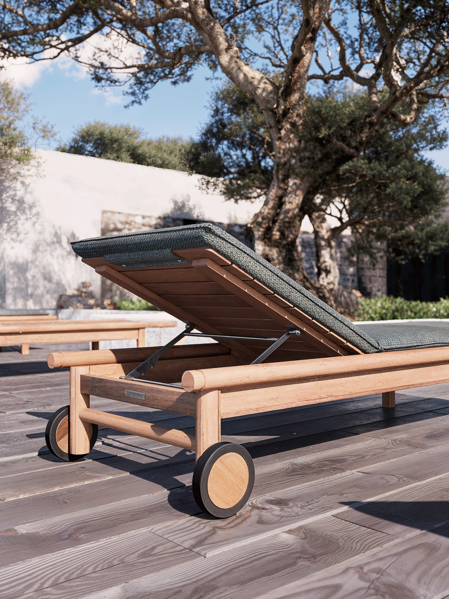 The Panama lounger features a solid teak seat, all slatted with a handle for easy transport. Completing the configuration is the optional padded mattress available in all fabrics of the collection. Wheels and handle ensure comfort and practicality in any outdoor setting, from the garden to the terrace.