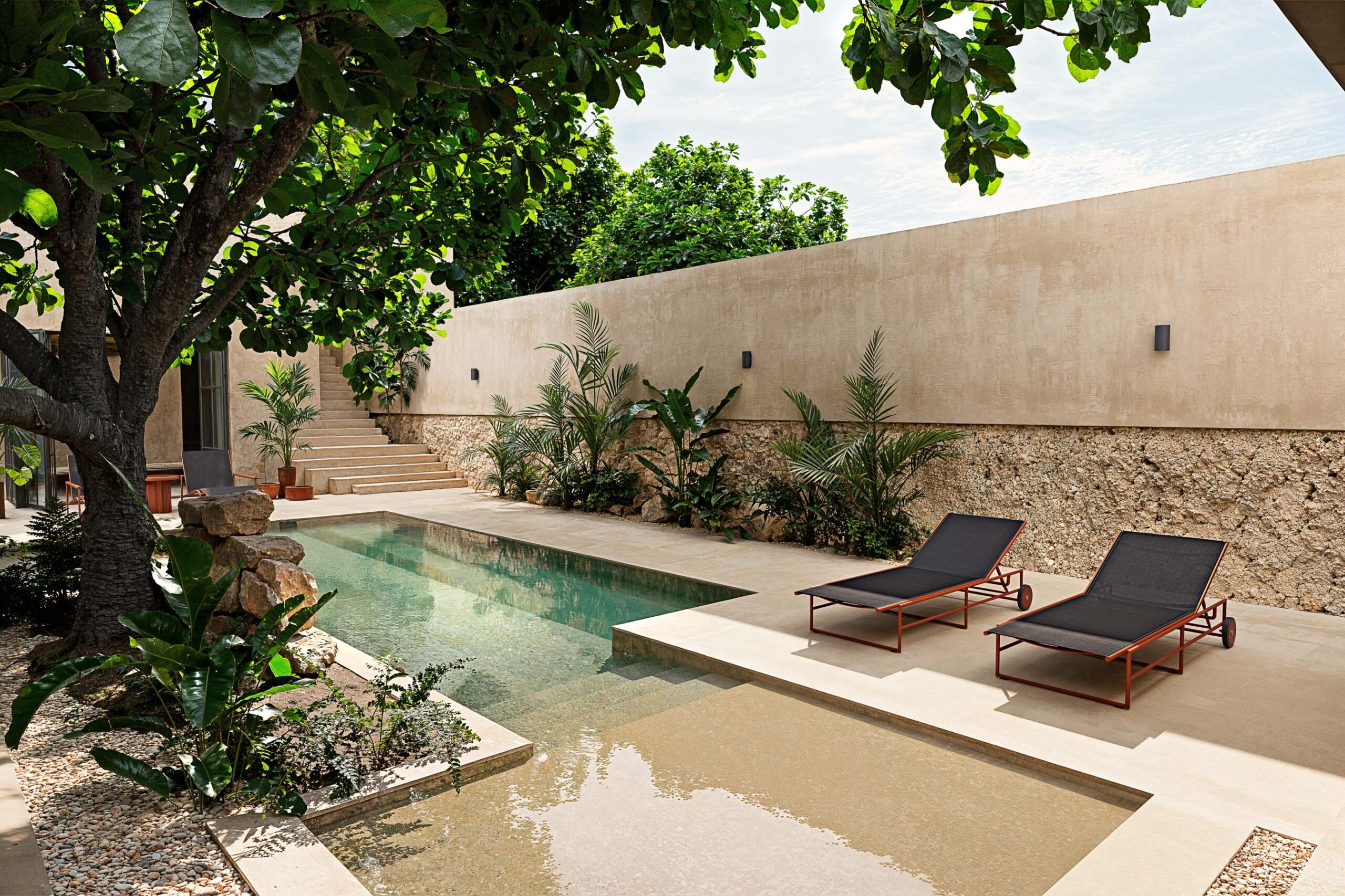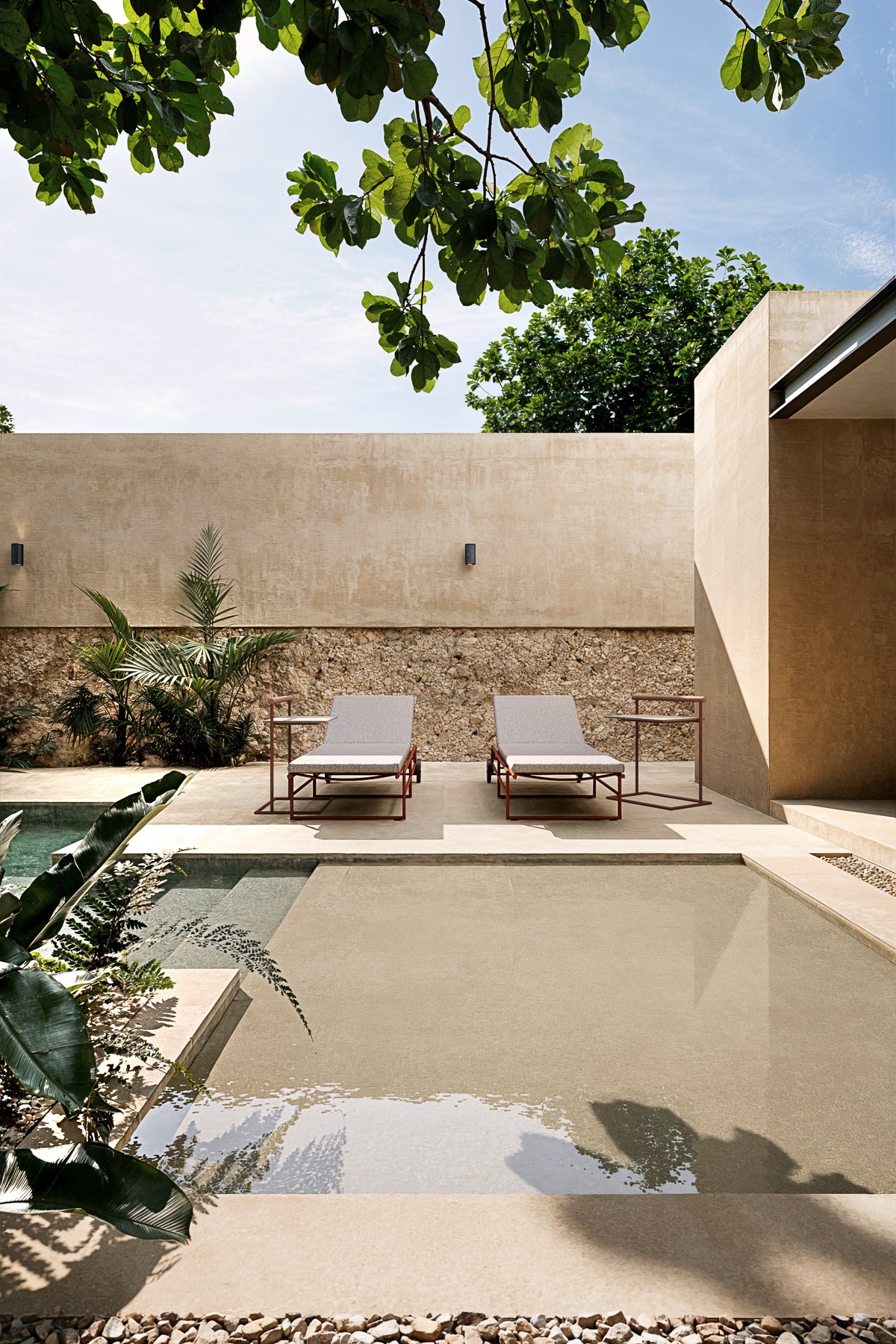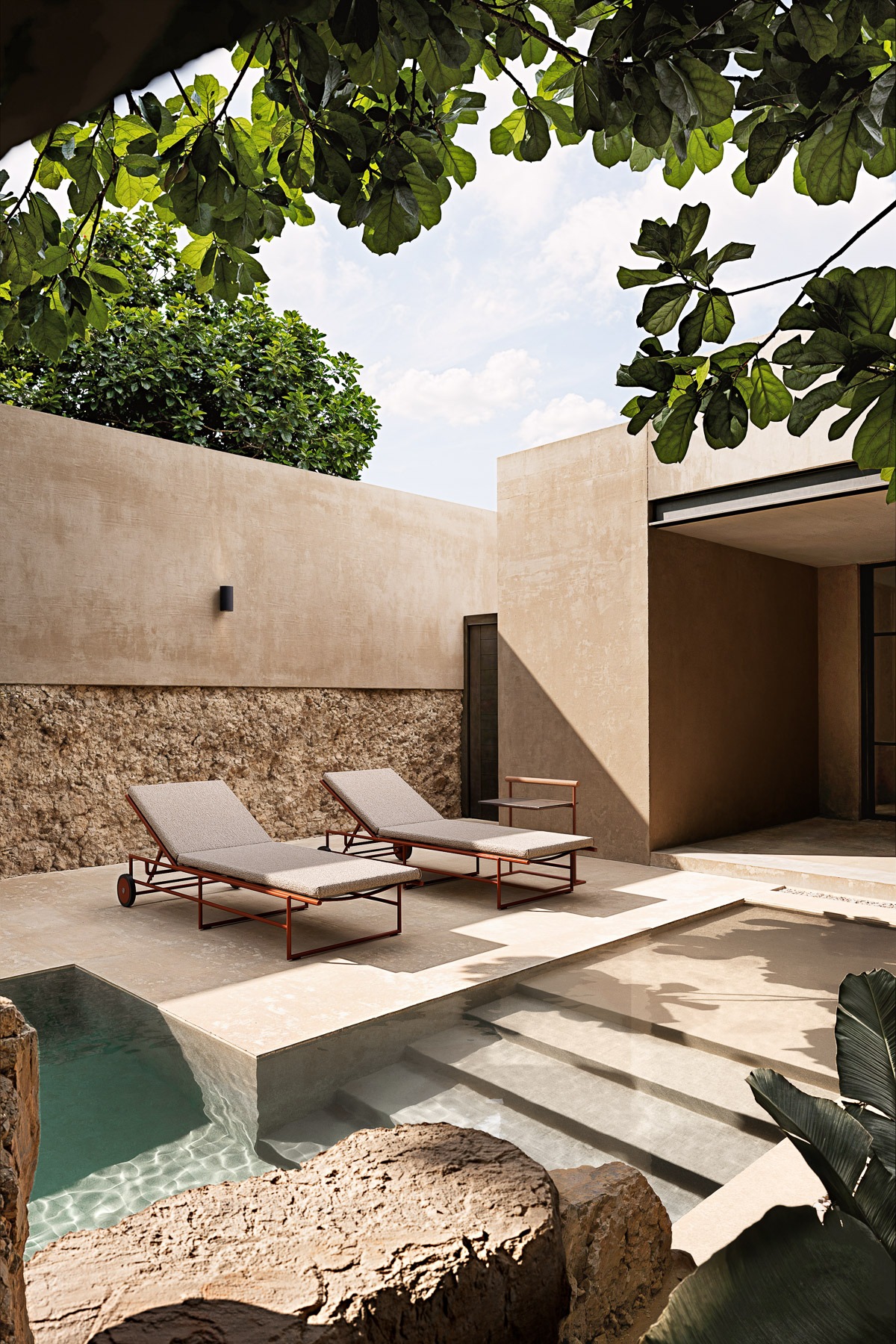 Chaise Longue with a design characterized by bold geometries, featuring a round tubular steel frame with epoxy coating that provides lightness and resistance to weather conditions. The textilene seat ensures breathability, easy cleaning, and suitability for outdoor use.