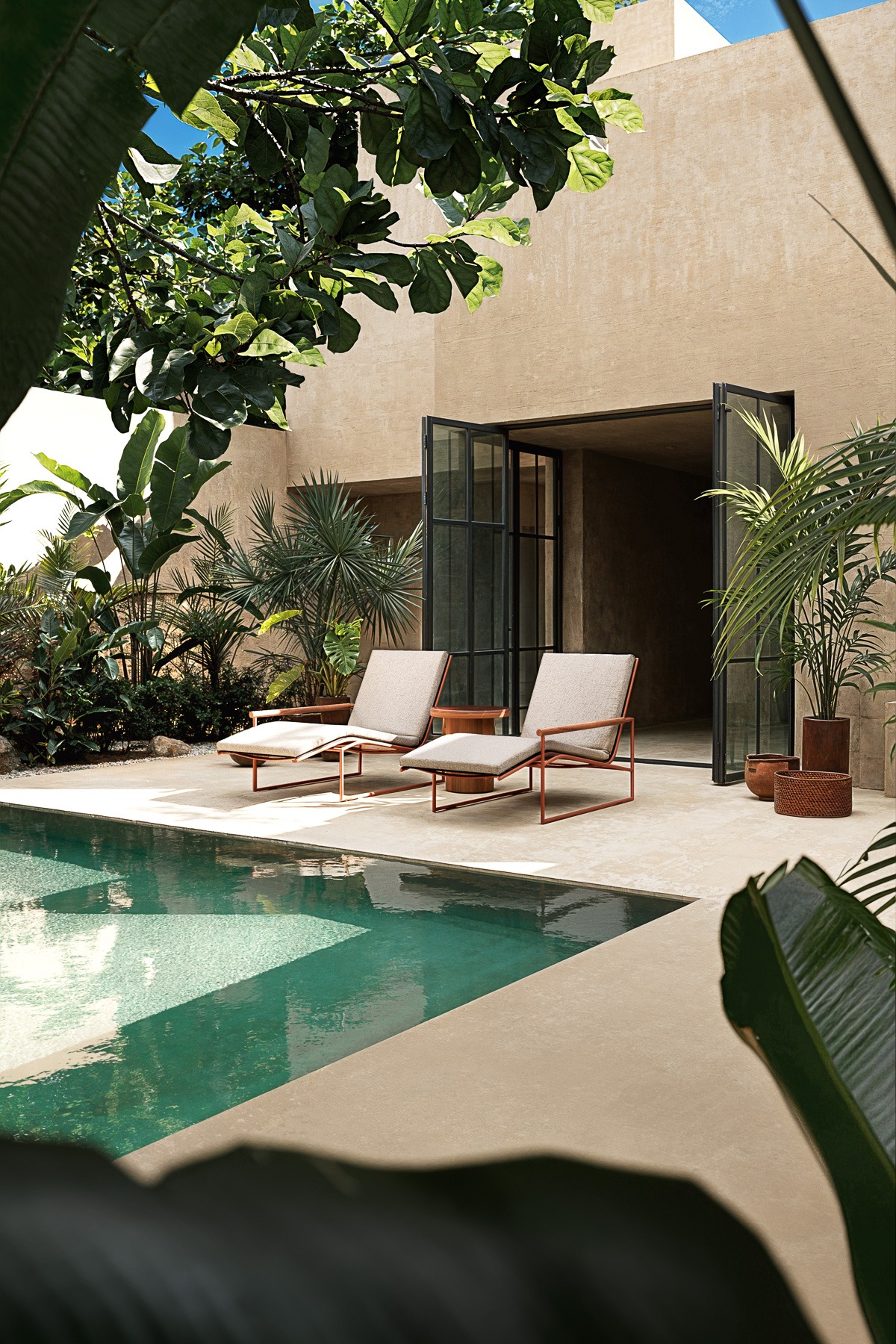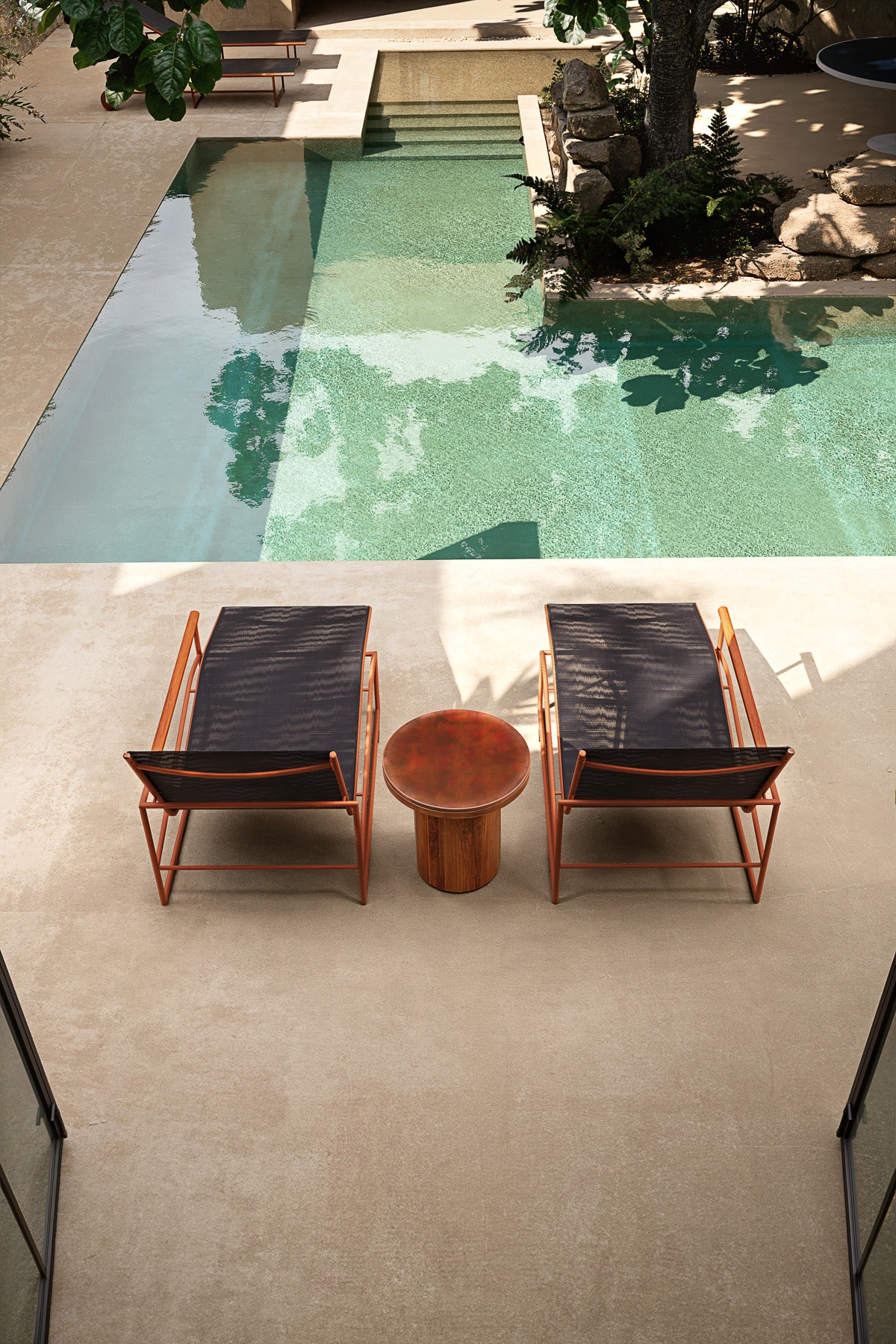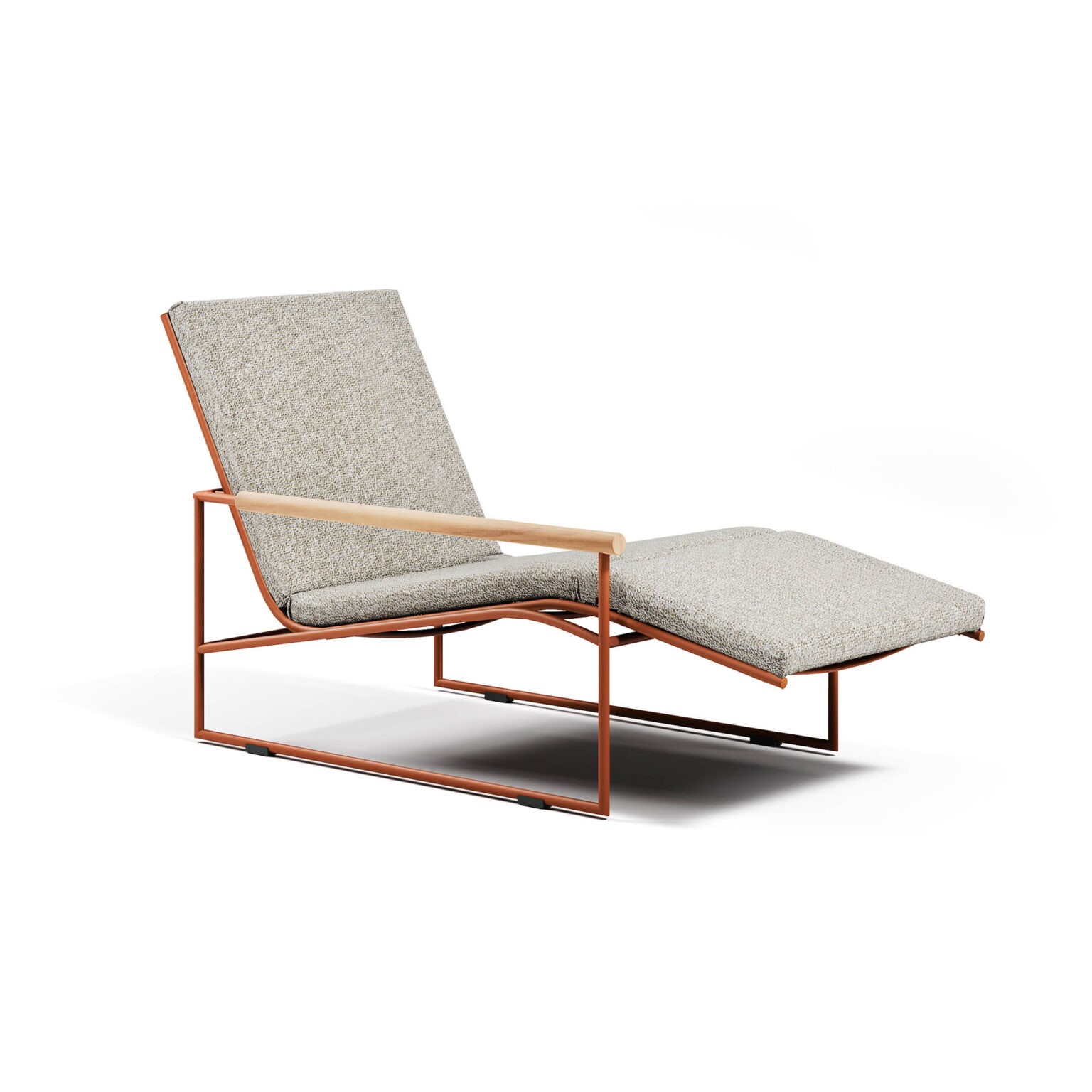 The PIPE dormeuse features a sleek and linear design, with a round tubular steel frame coated in epoxy for lightness and resistance to weather conditions. The ergonomic textilene seat provides optimal comfort, making it ideal for outdoor relaxation. Teak armrests add a touch of natural warmth and sophistication, perfectly complementing modern and refined spaces.