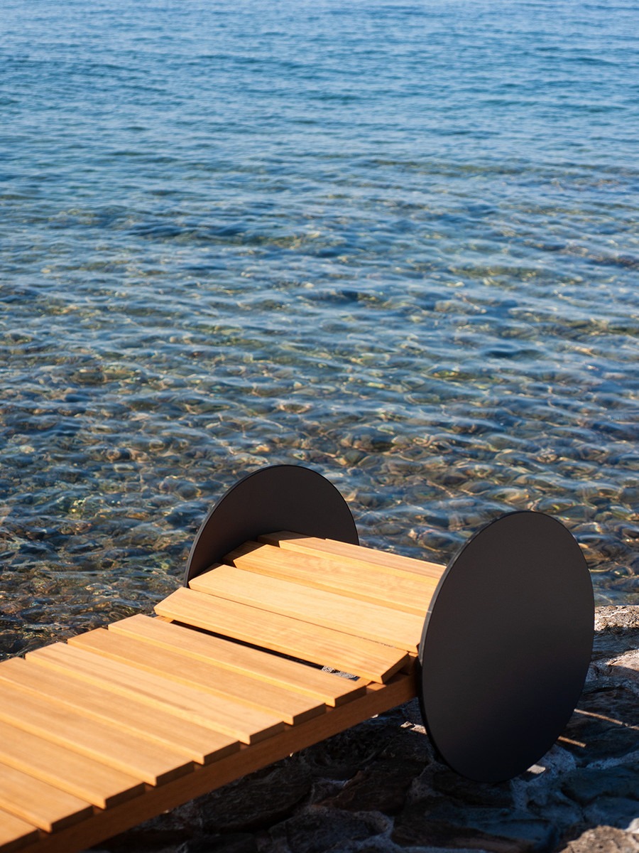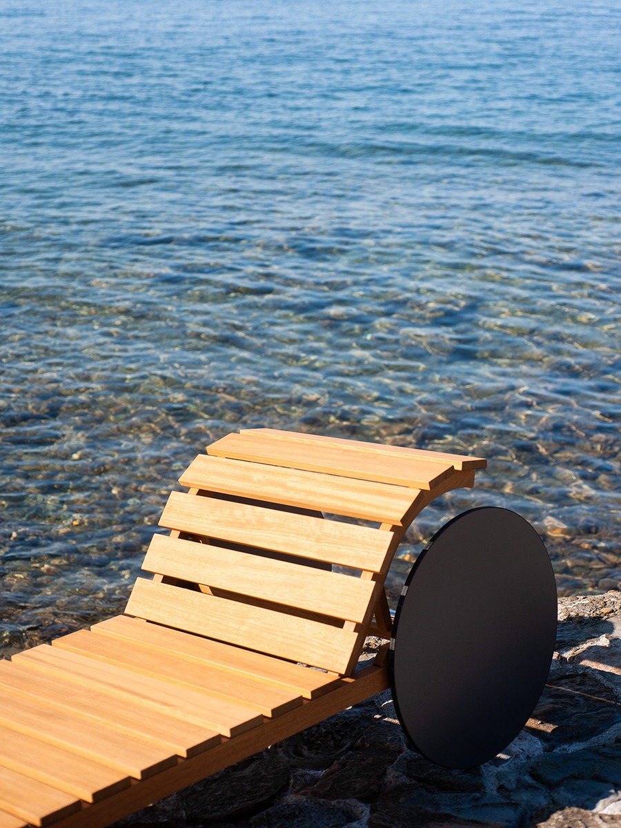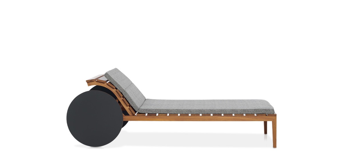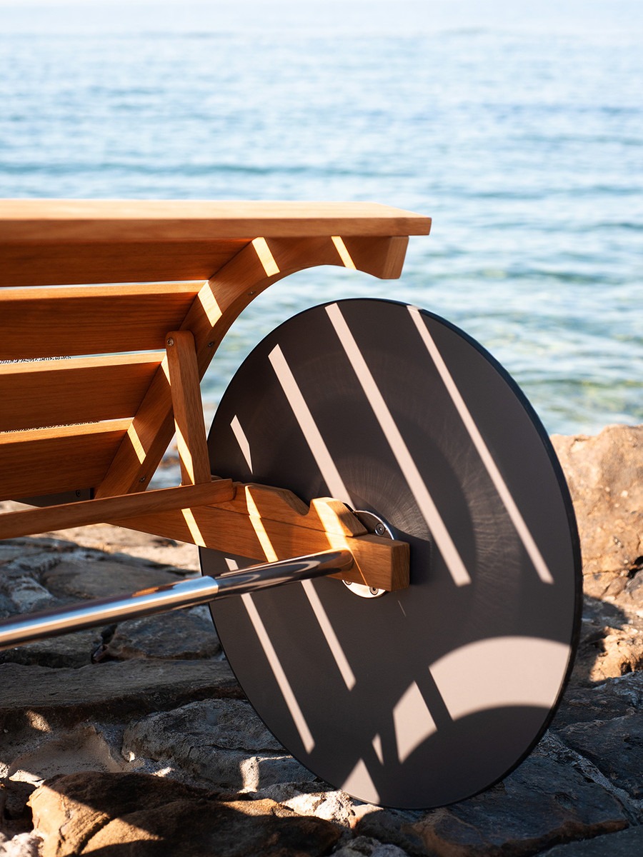 Suno reinterprets the universal shape of the sunbed, distinguishing itself by the large HPL wheels with a 57 cm diameter.A hyperbole that makes of a functional element the aesthetic trait that characterizes the project.With a structure in solid Iroko wood slats, accompanied by an optional mattress padded in DryFeel, Suno has a backrest adjustable at different inclinations, giving the possibility to enjoy outdoor relaxation in the name of maximum comfort.