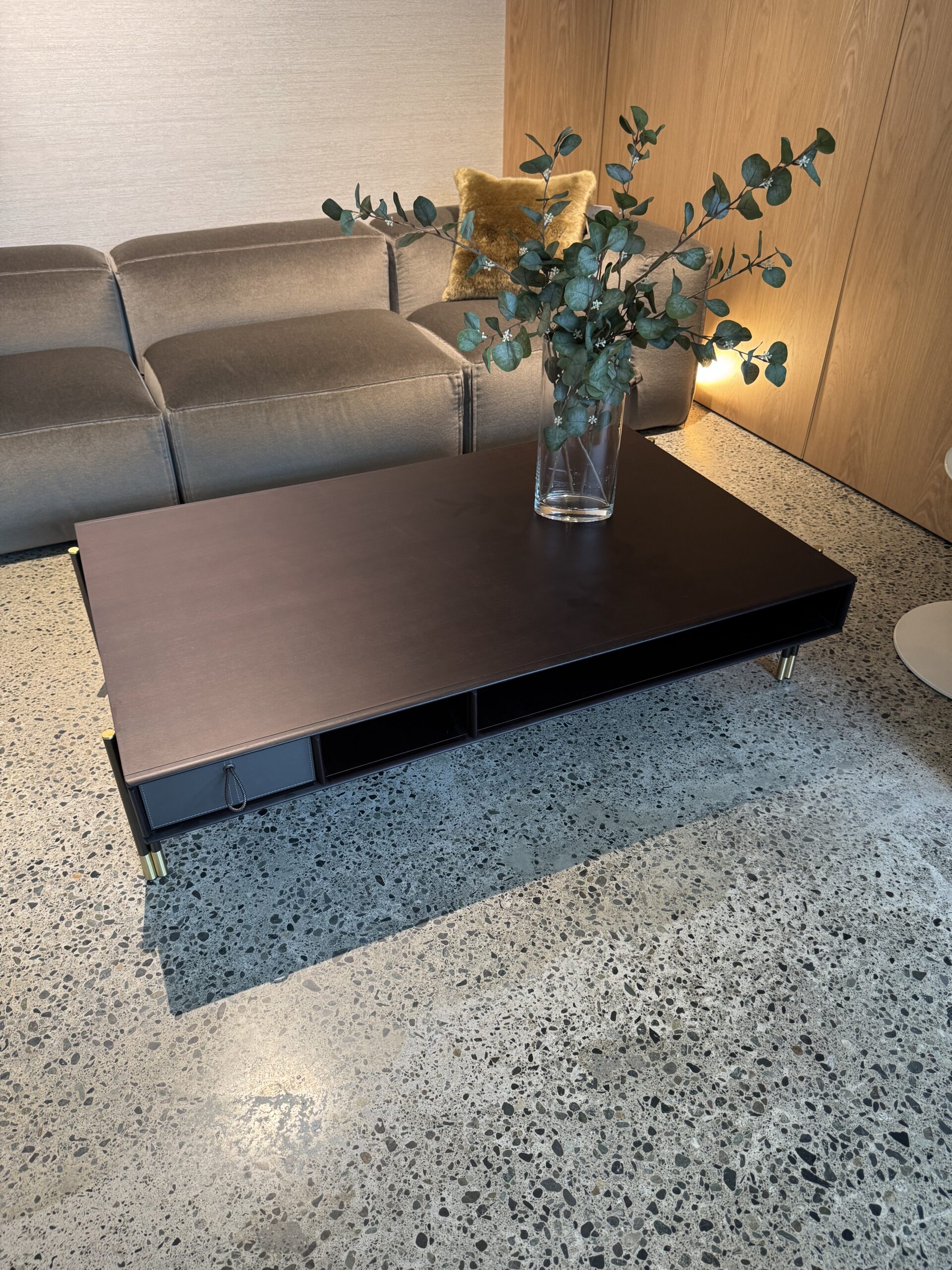 The Bayus coffee table with two drawers by Porada is available in only one size. The structure is available in solid canaletto walnut wood. The base of the Bayus coffee table is made of bronzed metal with brushed brass tips.