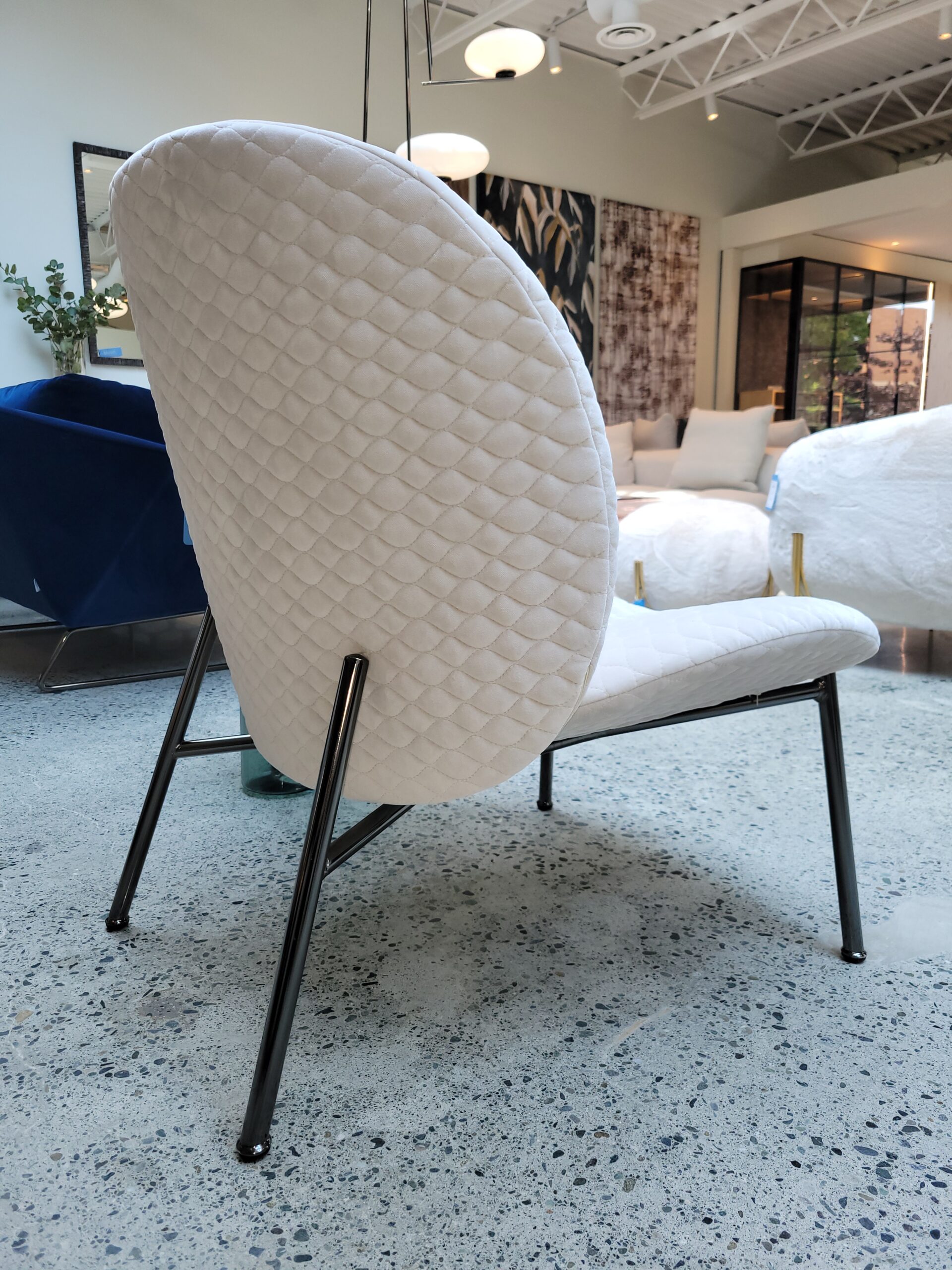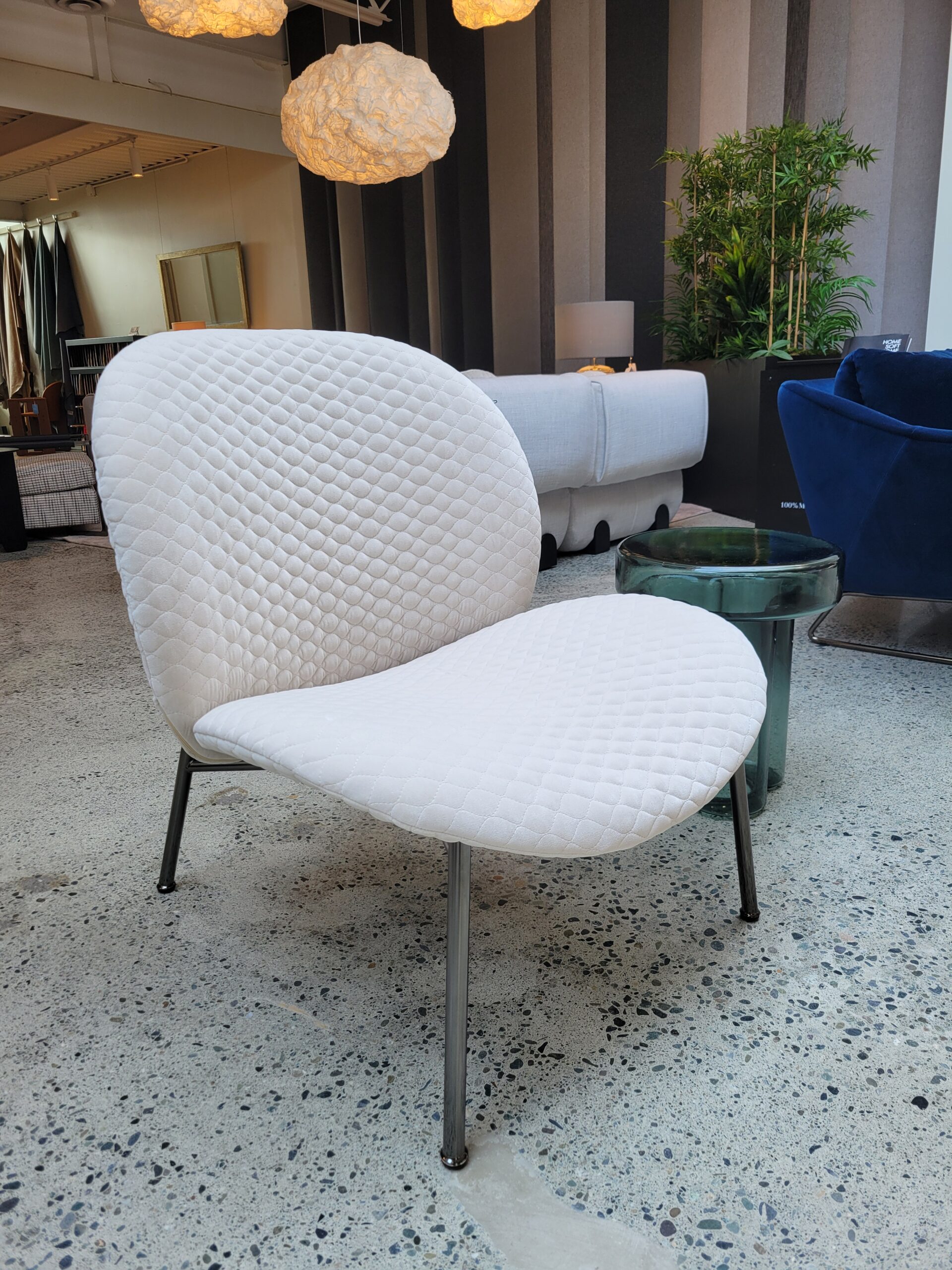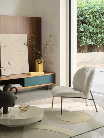 Ola originates from a simple idea but at the same time represents a complex concept – a welcoming arm chair created utilising four individual curved sheets. Each sheet converges towards a single centre. Four sheets become two sheets for the variation without arm rests. The metal frame has an essential and graphic silhouette in contrast with the padded rounded forms. The cover is completely removable.
